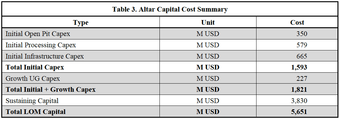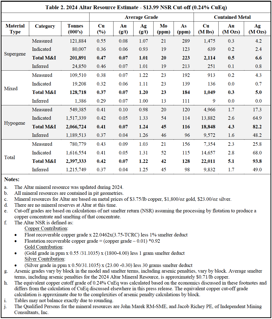 On November 25, 2024, the Company announced an updated mineral resource estimate (“MRE”) for the Altar project (see Table 2). The PEA is based on the MRE; however, the PEA production profile is based on a subset of the MRE, utilizing different metal prices, operating costs, and mining methods.