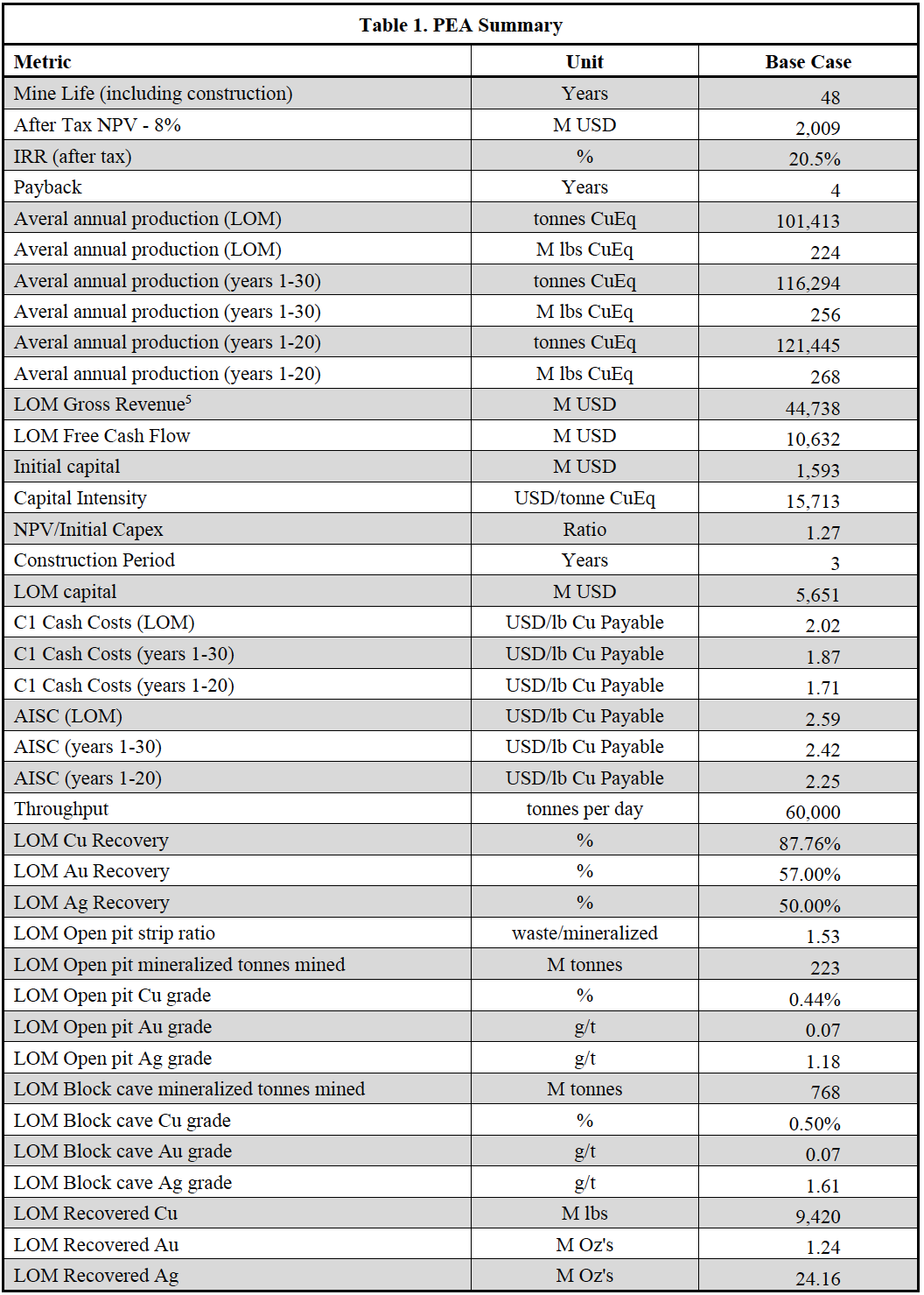 - CuEq calculated in the PEA study using $4.35/lb Cu, $2,500/oz Au and $27/oz Ag and is reported utilizing recoveries of 87.76% for Cu, 57% for Au, and 50% for Ag.