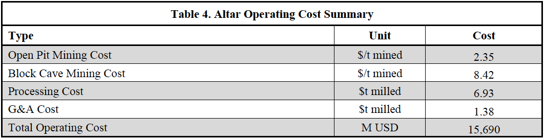 Operating costs were estimated for the open pit mining operation, block caving mining operation, the concentrator processing operation, and G&A. A summary of the estimated operating costs is presented in Table 4. The buildup of LOM C1 cash costs and AISC can be found in Tables 5 and 6, while operating costs by year can be found in Figure 6.