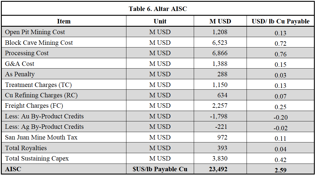 - All in Sustaining Costs (“AISC”) of $2.25/lb payable Cu for the first 20 years1, $2.42/lb payable Cu for the first 30 years1, and $2.59/lb payable Cu for the LOM