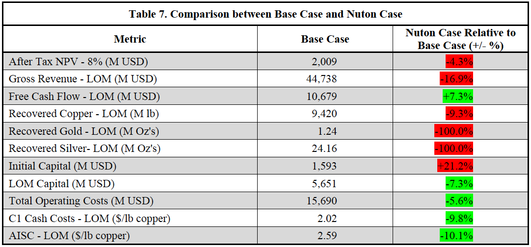 To demonstrate the Nuton Case, the variance percentage relative to the Base Case is included here for selected key production and financial metrics. The results of the Nuton Case can be found in Table 7. Measurable contributors to capital spend include a Tailings Storage Facility (TSF) for the Base Case and a Heap Leach Pad (HLP) for the Nuton Case. The Nuton case shows higher initial capital requirements due to the need for more infrastructure from the start-up (e.g. full-sized ponds) compared to a TSF. However, LOM capex in the Nuton Case is lower, as TSF requires higher sustaining capex to reach final capacity. Additionally, at this time, precious metals such as gold and silver cannot be recovered with Nuton® Technology, whereas they are recovered in the Base Case. Timing of capital and revenue from copper equivalent reduces the NPV for the Nuton Case, but lower total capital and lower operating C1 and AISC costs allow for a higher Free Cash Flow in the Nuton Case.